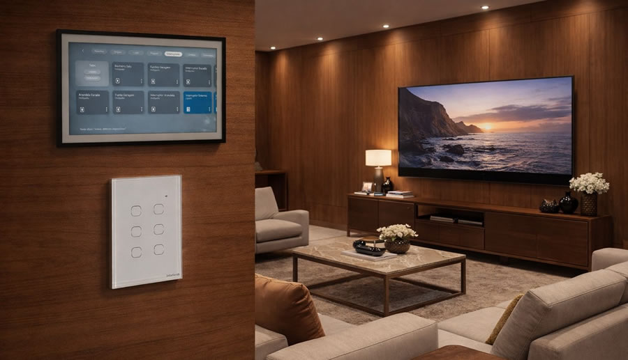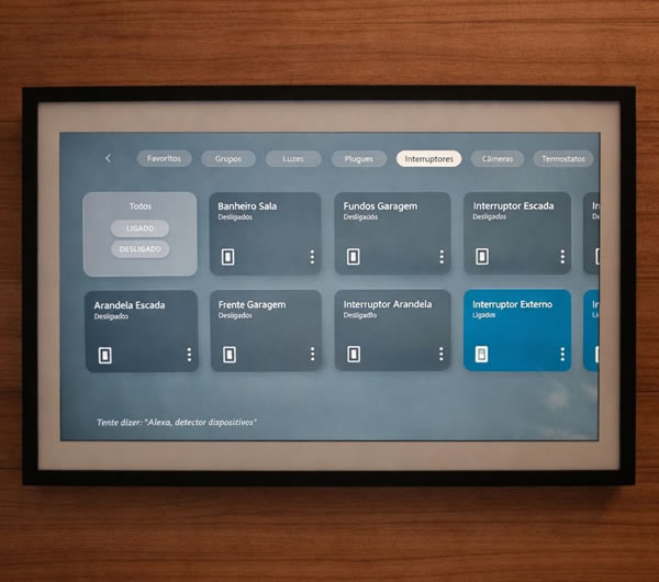 Automação residencial integrada para controle de iluminação, portões, câmeras, ar-condicionado e outros dispositivos, tudo pelo celular ou por comando de voz, trazendo mais conforto, segurança e praticidade.